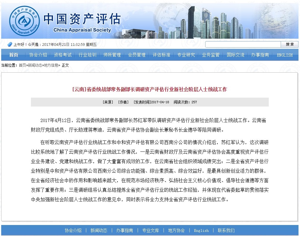 中國資產(chǎn)評估協(xié)會(huì )于2017年4月18日對本次調研活動(dòng)進(jìn)行了報道。(原文地址:http://www.cas.org.cn/xwdt/dfxx/54568.htm)