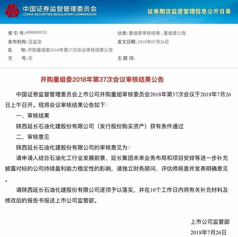 證監會(huì )并購重組委2018年第37次會(huì )議于7月26日上午在北京召開(kāi),陜西延長(cháng)石油化建股份有限公司(發(fā)行股份購買(mǎi)資產(chǎn))獲有條件通過(guò)。中和資產(chǎn)評估有限公司陜西同盛分公司承辦了該項目的資產(chǎn)評估工作,簽字評估師是王益龍和薛松。