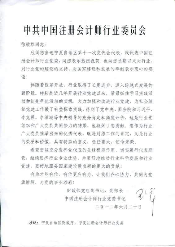 中和資產(chǎn)評估有限公司寧夏瑞衡分公司總經(jīng)理徐敬旗同志當選寧夏回族自治區第十一次黨代會(huì )代表,財政部黨組副書(shū)記、財政部副部長(cháng)、中國注冊會(huì )計師行業(yè)黨委書(shū)記王軍同志發(fā)來(lái)賀信表示祝賀。